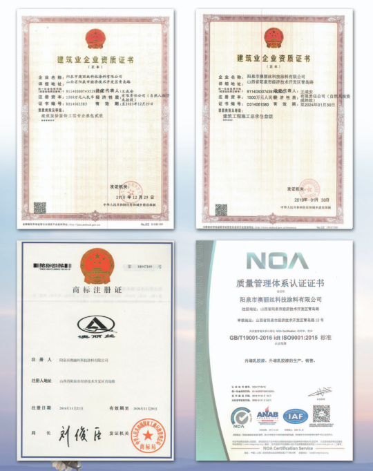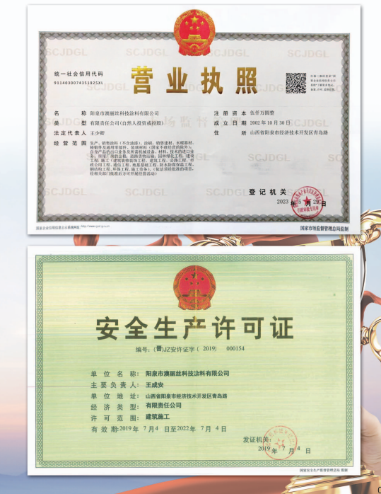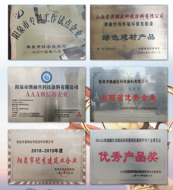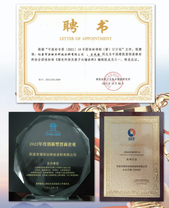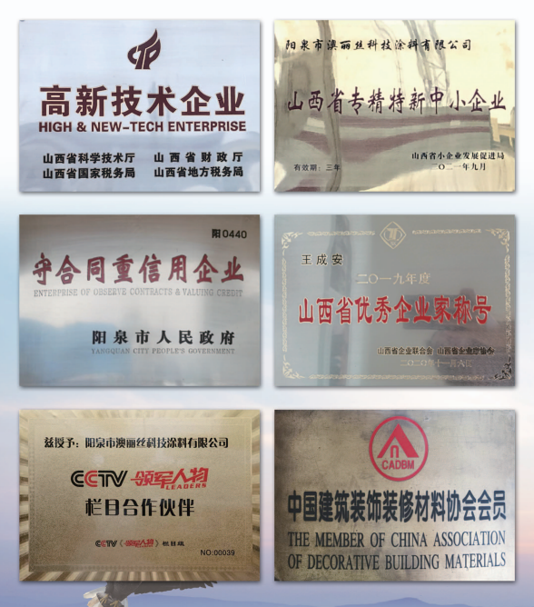 陽泉市澳麗絲科技涂料有限公司本著“建標(biāo)準(zhǔn)化管理體系、帶高標(biāo)準(zhǔn)團(tuán)隊(duì)、打造民族品牌”的目標(biāo),公司規(guī)模不斷擴(kuò)大,現(xiàn)已擁有高級管理人員16人,高級工程師8人,科研人員9人,工程項(xiàng)目經(jīng)理5人,員工260人,是一支技術(shù)力量雄厚的年輕團(tuán)隊(duì)。公司先后獲得山西省“高新技術(shù)企業(yè)”、“專精特新中小企業(yè)”、榮獲“AAA信用企業(yè)”、“山西省優(yōu)秀企業(yè)”、“山西省著名商標(biāo)”、山西省建設(shè)廳頒發(fā)的“優(yōu)秀產(chǎn)品獎”、山西省民營經(jīng)濟(jì)促進(jìn)會副會長單位、陽泉市人民政府頒發(fā)的“重合同守信用企業(yè)”、“陽泉市優(yōu)秀建筑企業(yè)”、“陽泉市企業(yè)聯(lián)合會、陽泉市企業(yè)家協(xié)會、陽泉市工業(yè)經(jīng)濟(jì)聯(lián)合會副會長單位”,并于2023年1月獲得了由山西省促進(jìn)民營經(jīng)濟(jì)發(fā)展工作組、山西省工商業(yè)聯(lián)合會、山西省商務(wù)廳、山西省民政廳、山西省貿(mào)促會、山西省小企業(yè)發(fā)展促進(jìn)局、山西省投資促進(jìn)局、山西省人民政府駐上海辦事處聯(lián)合主辦的世界晉商上海論壇活動組織工作委員會頒發(fā)的“2022年度創(chuàng)新型晉商企業(yè)”等多項(xiàng)榮譽(yù)。